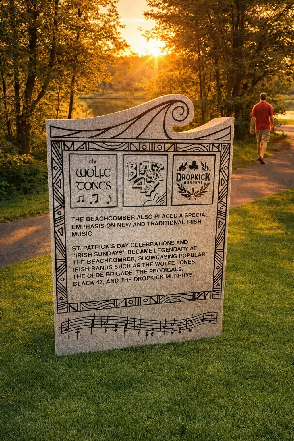 A rhythmic arc of memory—where granite, shoreline, and echoes of music meet in tribute.